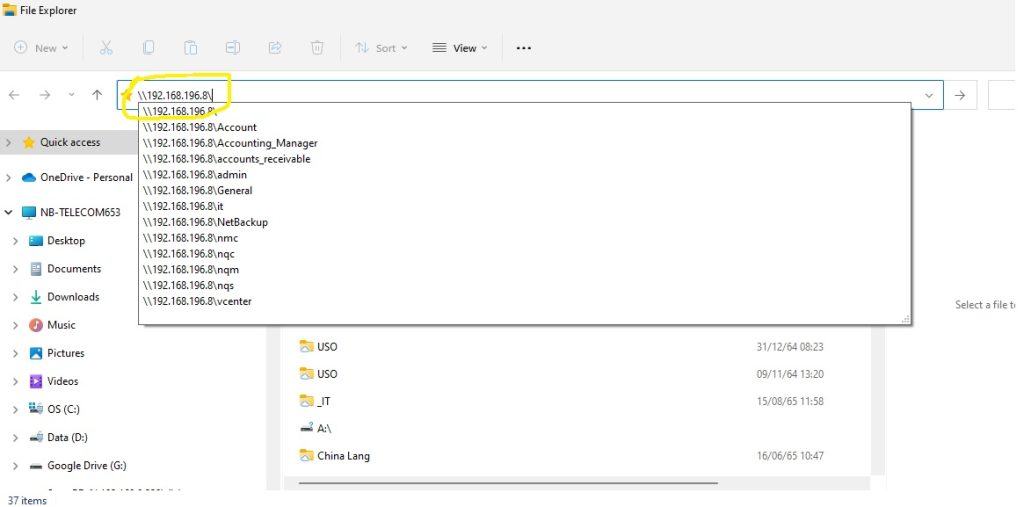 เปิด file Explorer พิมพ์ ที่อยู่ Drive เช่น \\192.168.196.8\ แล้วกด Enter 2. หากมี pop up ถาม user Password ให้ ใส่ user ตาม email แต่ไม่ต้องมี @interlinktelecom.co.th ตามตัวอย่างด้านล่างนี้ 3. เมื่อขึ้นตามรูปด้านล่างนี้ ให้คลิ๊ก ขวา ที่ Folder ที่ต้องการ Map Drive 4. เมื่อคลิ๊กขวา แล้วให้เลือก Map network Drive.. ตามรูปด้านล่างนี้ 5. เลือกตัวอักษรแทน Drive แล้ว กด Finish ก็จะได้ Drive กลาง ตามต้องการ