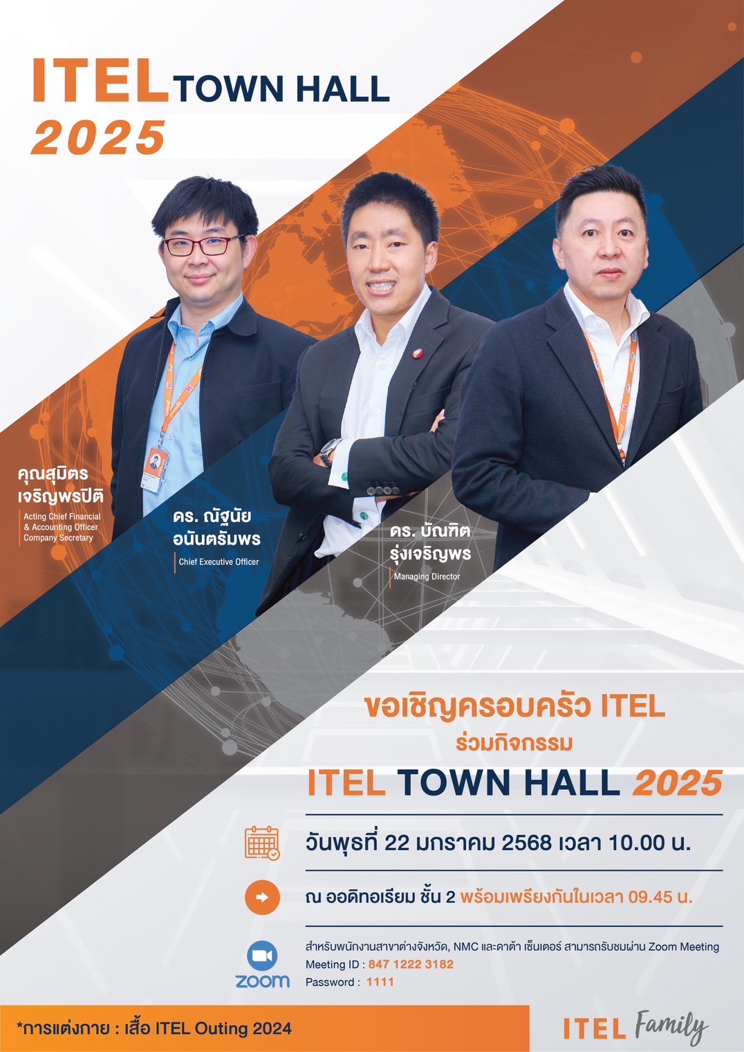 ขอเชิญ ครอบครัว ITEL ร่วมกิจกรรม ITEL TOWN HALL 2025 วันพุธที่ 22 มกราคม 2568 เวลา 10:00 น. ณ ออดิทอเรียมชั้น 2 พร้อมเพียงกันในเวลา 09:45 น. ขอเชิญครอบครัว ITEL ร่วมกิจกรรมITEL TOWN HALL 2025วัน พุธที่ 22 มกราคม 2568 เวลา 10.00 น.ณ ออดิทอเรียม ชั้น 2 (พร้อมเพรียงกันในเวลา 9.45 น.) สำหรับพนักงานสาขาต่างจังหวัด, NMC และดาต้า เซ็นเตอร์ สามารถรับชมผ่าน Zoom Meetingได้ที่ Link : https://us02web.zoom.us/j/84712223182?pwd=zObcTfaMDEmcZeObE3zGVTEzacsS4x.1 Meeting ID : 847 1222 3182 Passcode : 1111