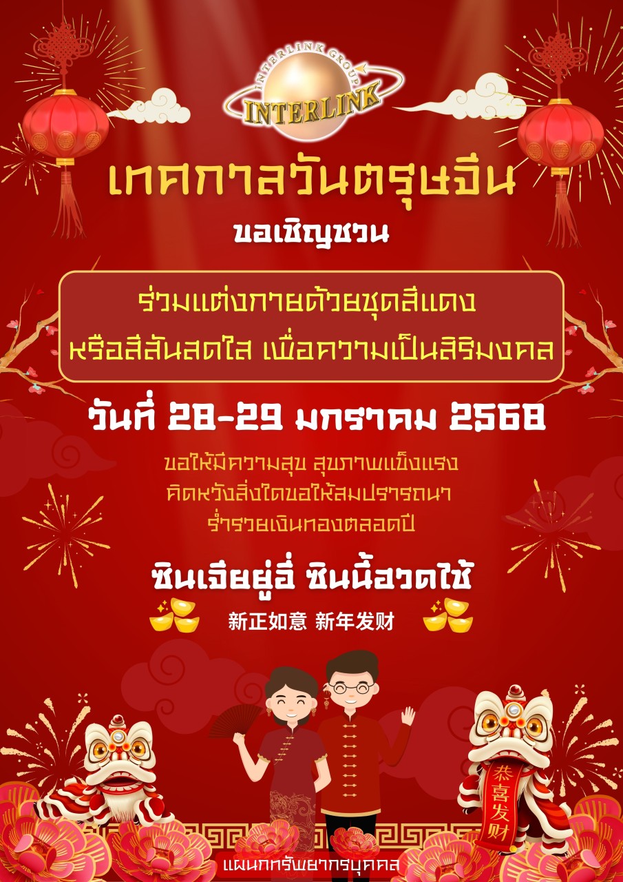 วันที่ 28-29 มกราคม 2568ขอเชิญชวนผู้บริหารและพนักงานร่วมแต่งกายด้วยชุดสีแดง หรือสีสันสดใสเพื่อความเป็นสิริมงคล ในเทศกาลตรุษจีน 🧧”ซินเจียยู่อี่ ซินนี้ฮวดไช้”🧧 คิดหวังสิ่งใดขอให้สมหวังสมปรารถนาในปีใหม่นี้มีแต่ความสุข มั่งคั่ง โชคดี ร่ำรวยตลอดปี