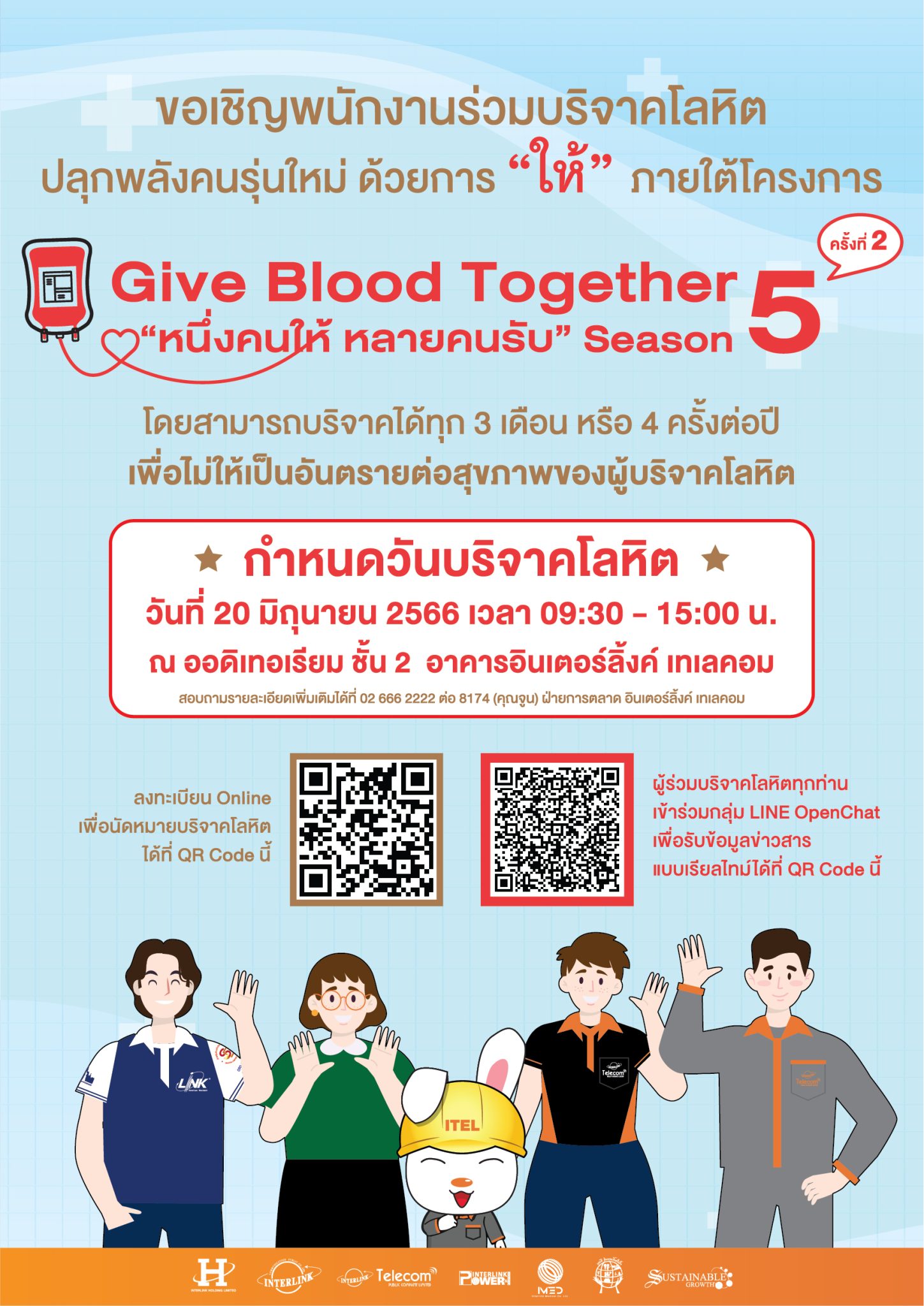 ขอเชิญพนักงานกลุ่มบริษัทอินเตอร์ลิ้งค์ ร่วมบริจาคโลหิต ภายใต้โครงการ Give Blood Together ” หนึ่งคนให้ หลายคนรับ ” Season5 ครั้งที่2